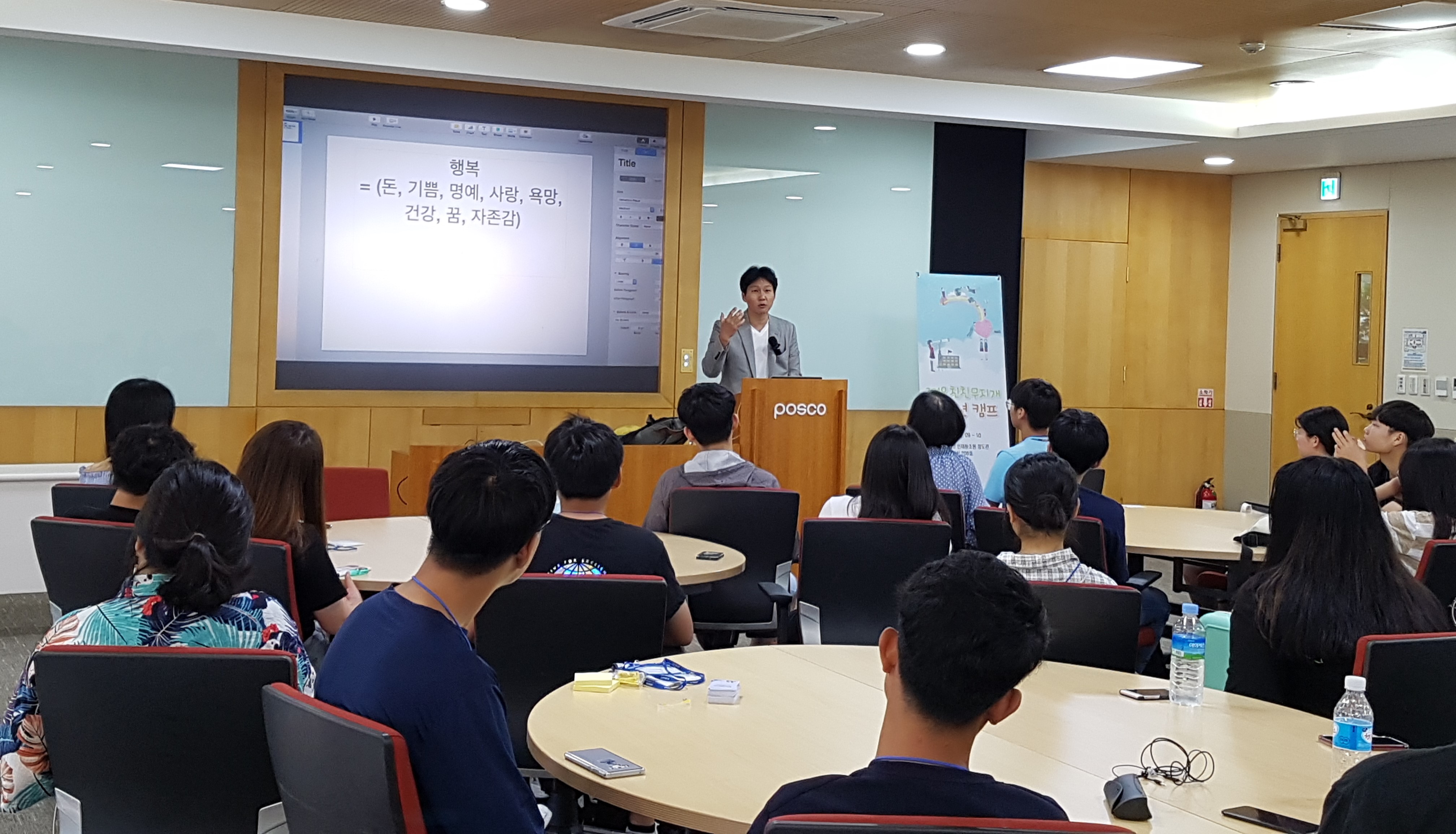 포스코 인재창조원에서는 서로 간의 공감 및 소통을 위한 레크레이션과 함께 프로젝트 참가 선배들의 이야기와 근황, 학업과 진로고민 등을 공유하였다. 안영일 DCG대표는 ‘미래사회 꿈과 진로’를 주제로 문답형식으로 장학생들의 궁금증에 대해 답하며, 자신의 경험담과 함께 특강을 진행해나갔다. 이후에는 여름철 건강한 생활을 도모하기 위해 배움 활동으로 모기퇴치 스프레이, 천연버물리, 과메기비누 만들기를 진행하였다.