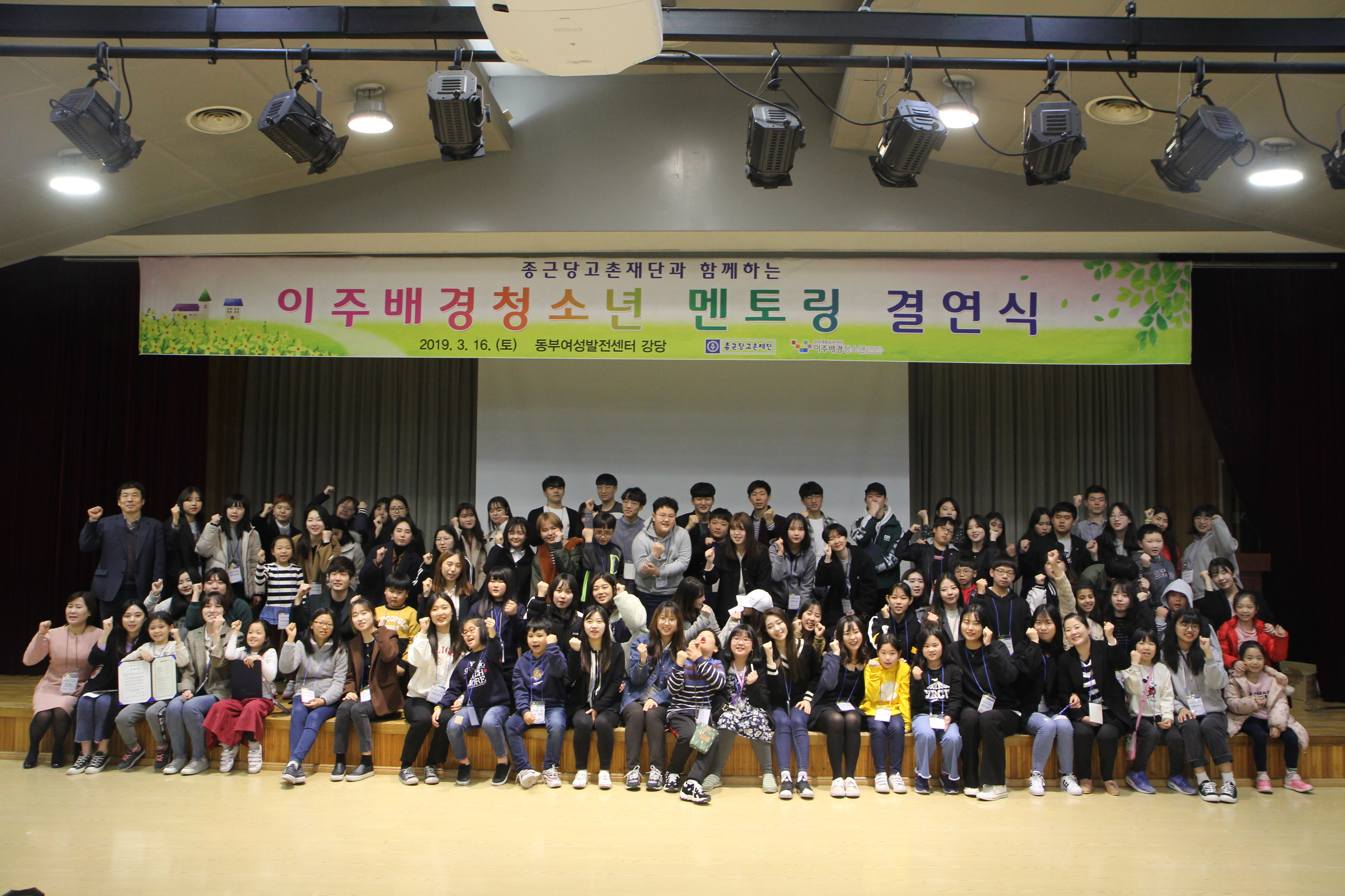 이주배경청소년지원재단(무지개청소년센터)은 지난 3월 16일(토) 동부여성발전센터 강당에서 이주배경청소년 멘토링 결연식을 진행하였다. 종근당고촌재단(이사장 김두현)과의 업무협약으로 50명의 종근당고촌재단 장학생(멘토)들과 이주배경청소년(멘티) 50명이 참여하게 된다.