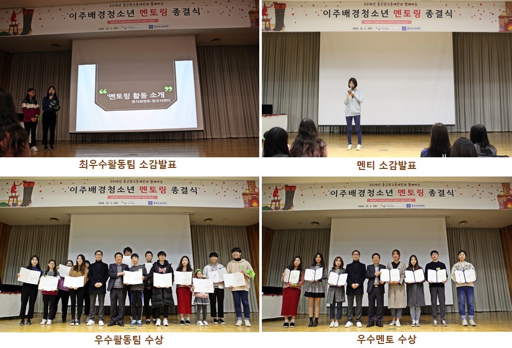 종근당고촌재단과 함께하는 이주배경청소년 멘토링활동의 종결식이 12월 1일(토) 동부여성발전센터(건대입구역 인근)에서 진행되었다. 이번 종결식은 9개월 동안 활동한 멘토-멘티 70팀이 참석하여 그동안의 활동을 마무리하고 격려 받는 시간이었다.