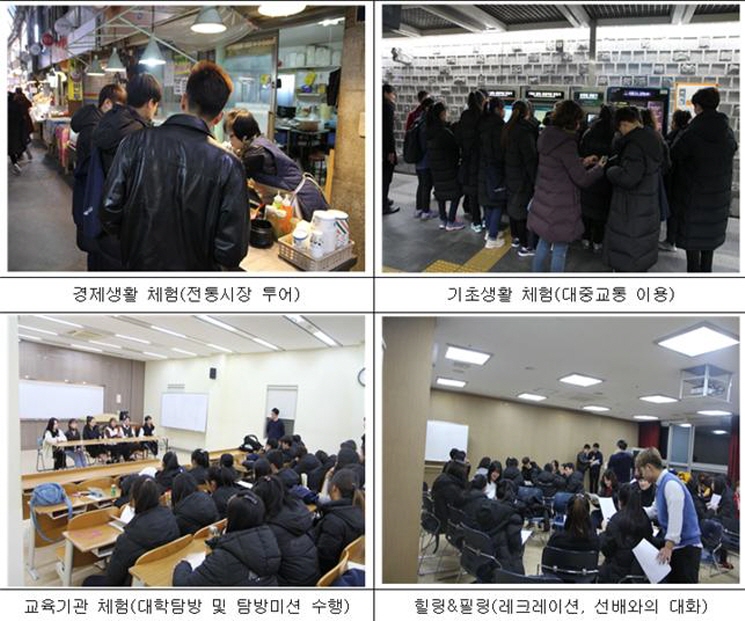 대학교 자원봉사자들이 함께한 교육기관 체험(대학탐방 및 탐방미션 수행)을 통해 대학교에서 배울 수 있는 것, 할 수 있는 활동 등을 익힌 청소년들은, 직접 학생식당에서 저녁을 먹은 후 숙소로 이동해 즐거운 시간을 가졌다. 서로를 알아가는 친교의 시간(레크레이션), 먼저 탈북해 정착 중인 선배 또래강사와의 대화시간 이후 장기자랑 시간까지, 열정 가득한 추억을 쌓은 청소년들은 이튿날 체험을 위해 숙면을 취했다. 2일차에는 한국의 대표적인 문화인 한복과 한옥을 만끽할 수 있는 전통문화체험으로, 남산골 한옥마을에서 각양각색의 한복을 입고 총 다섯 채의 한옥마을을 누비면서 수수께끼와 사진 촬영을 하는 프로그램에 참여했다. 또 하나의 경제생활 체험(백화점 쇼핑 및 구매체험)에서는 물건을 고르고 살 수 있는 장소 중 하나인 백화점에서 어떤 물건을 살지 둘러보고 선택해보는 체험을 했으며, 마지막으로 그 동안 배운 학습내용을 골든벨 퀴즈 형식으로 풀어보기, 만족도 조사, 소감 발표 및 마무리까지 힘차게 달려온 일정을 무사히 마쳤다.