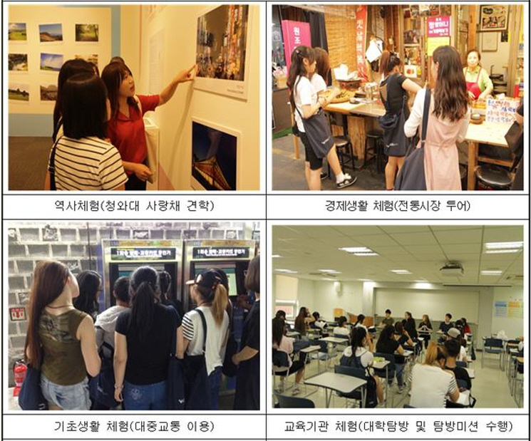 어느새 올해 세 번째를 맞이한 이번 프로그램에는 총 19명의 탈북청소년들이 참여해 서울 시내 일대를 다니며 다채로운 현장체험을 했다. 먼저 오리엔테이션 및 모둠별 활동을 통해 전체 일정 및 세부내용을 익혔으며, 이어서 역사 체험(청와대 사랑채 견학), 경제생활 체험(전통시장 투어 및 구매체험, 백화점 쇼핑), 기초생활 체험(교통카드 충전 및 버스&지하철 타기), 교육기관 체험(대학탐방 및 탐방미션 수행), 문화 체험(한복입기 및 남산골 한옥마을 투어) 순으로 체험활동을 한 다음 센터에서 소감 발표 및 마무리를 진행했다. 특히 탈북 선배들인 또래강사들과, 대학탐방 자원봉사자들도 함께 활약해 체험활동의 효과성을 높였다.