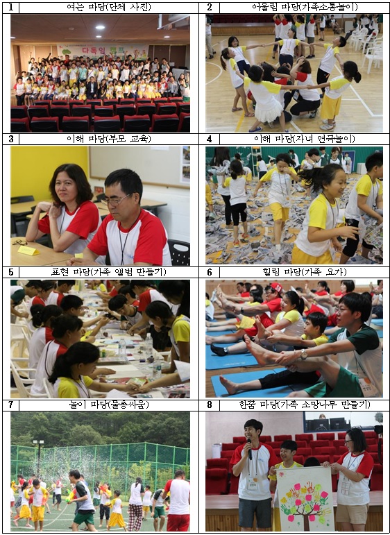 이번 캠프는 물총싸움을 통해 더위와 스트레스를 해소하는 놀이마당과 가족을 이해하기 위한 부모 교육 및 자녀 연극놀이로 구성된 이해마당, 세상에 하나 뿐인 가족 앨범을 직접 만드는 표현마당, 산책 및 가족요가, 가족소통놀이 프로그램을 통해 가족 간 친밀감을 향상시키는 힐링마당 및 어울림마당, 그리고 가족의 소망나무를 만들며 가족이 하나 되는 한꿈마당으로 구성되어 실시되었다.