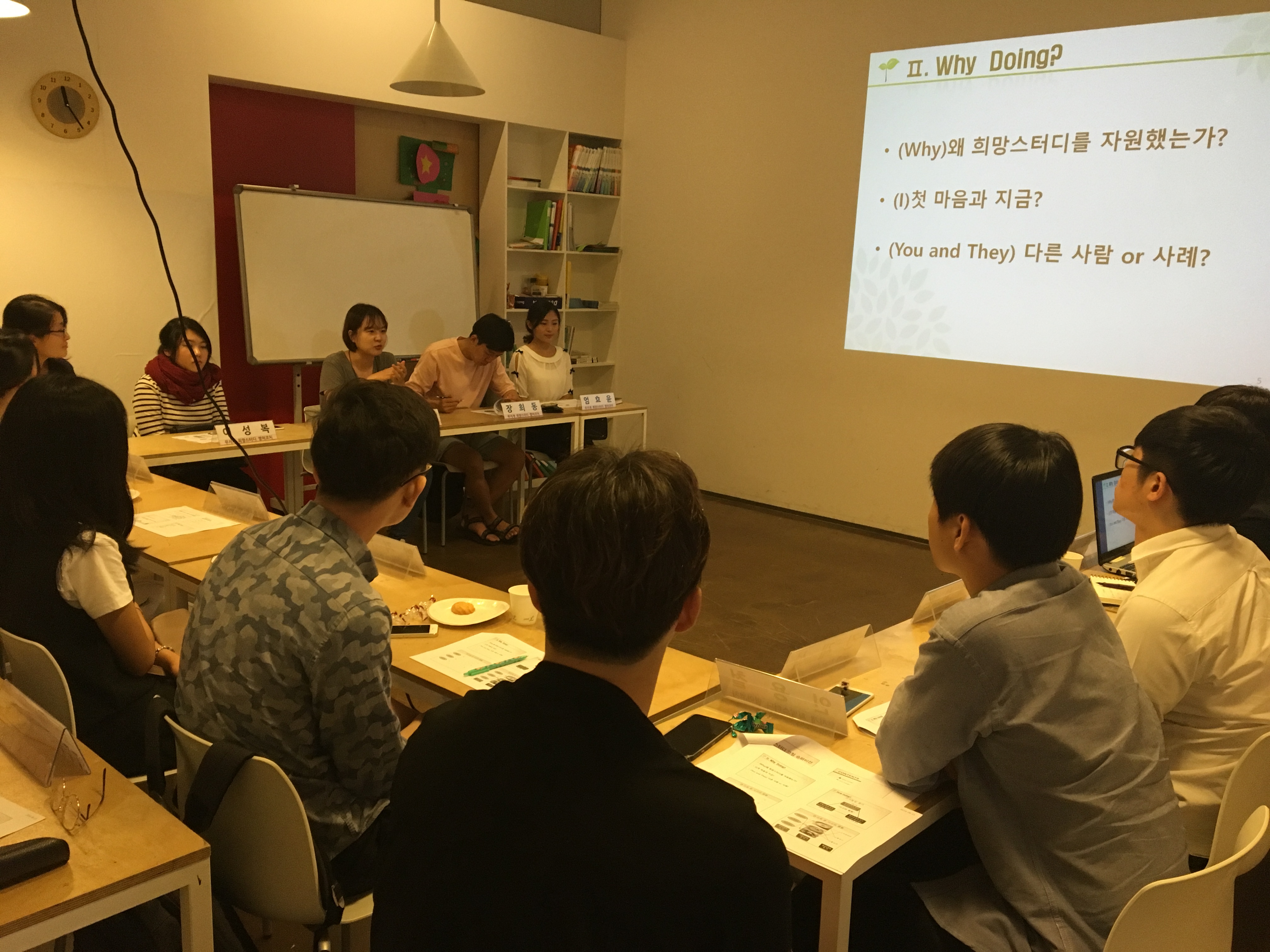 이번 2차 슈퍼비전에서는 서울‧경기지역에서 영어코칭 활동하고 있는 코치 선생님들과 유시은(고려대학교) 슈퍼바이저가 함께 모여 코치들의 희 망스터디 지원동기 및 초반 마음가짐을 되돌아보고 이를 기반으로 현재까지의 활동에 관하여 스스로 질문해보는 시간을 가졌다. 더불어 활동하면서 특별히 어려웠던 점들을 공유하며 개선방향을 함께 논의 해보는 의미 있는 시간도 보냈다. 슈퍼바이저는 탈북 청소년들이 왜 영어 학습에 유난히 큰 어려움을 겪는지에 대한 배경을 학술적인 관점에서 설명하고, 본인의 탈북 출신 대학생 영어교육 경험담을 공유함으로써, 코치들이 공통적으로 겪고 있는 영어코칭 어려움에 공감을 더하였다. 슈퍼비전은 끝으로 열심히 활동해 온 코치들을 칭찬하고, 향후 활동을 격려하면서 마무리되었다.