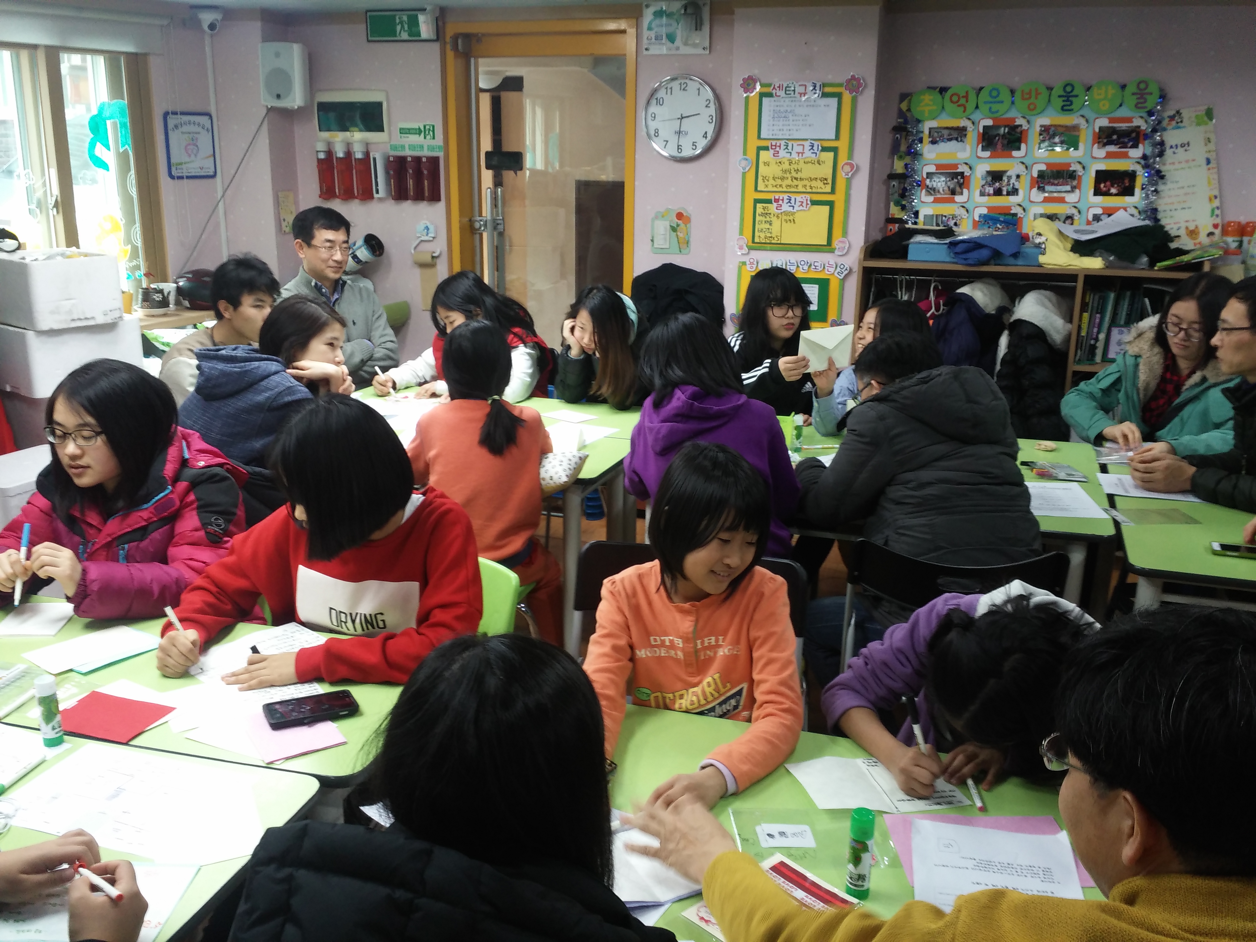 봉사활동에 앞서, 천국의아이들 지역아동센터에서 어르신께 드릴 연하장을 예쁘게 꾸미고 홀로 사시는 어르신들이