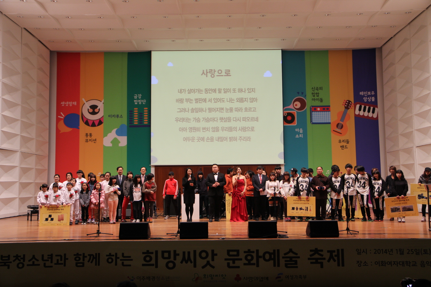 이주배경청소년지원재단은 지난 1월 25일 이화여대 음악관 김영의 홀에서 ‘탈북청소년과 함께 하는 희망씨앗 문화예술축제’를 개최했습니다. 이 행사는 한국수출입은행이 사회복지공동모금회에 지정 기탁하여 진행된 사업으로, 탈북청소년의 자존감 회복과 탈북청소년에 대한 일반인들의 인식제고를 위해 마련되었습니다.