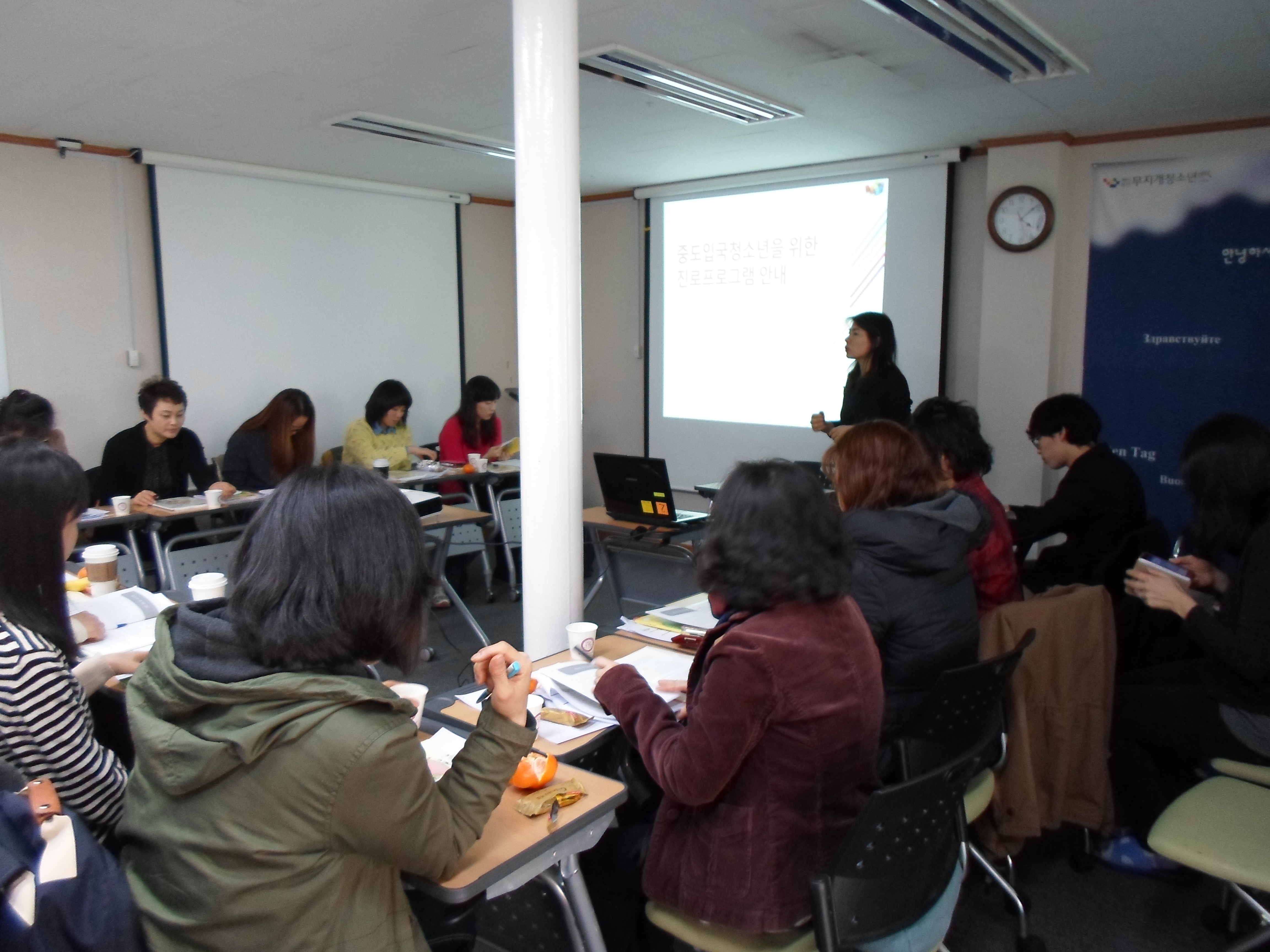 3월 7~8일, 2013년 레인보우스쿨 위탁기관 담당자를 위한 오리엔테이션이 진행되었습니다. 전국 10개 기관의 레인보우스쿨 위탁운영 담당자와 한국어 강사들이 한 자리에 모였습니다. 레인보우스쿨의 프로그램을 진행하고 있는 이주배경청소년지원센터의 신현옥 소장의 환영 인사를 시작으로 참여자들의 자기소개가 이어지면서 오리엔테이션 교육장은 밝은 미소와 웃음소리로 채워졌습니다. 이후에는 레인보우스쿨 운영 방안, 재단에서 개발‧제작된 \'진로지도 매뉴얼\', \'한국생활가이드\'에 대한 안내, 그리고 비자 교육이 있었습니다. 제천으로 이동한 후에는 2013년도 레인보우스쿨 운영에 관련된 질의·응답과 논의 시간이 마련되었습니다. 이런 시간을 통해, 신규 위탁기관은 궁금증을 해소하였고 기존 위탁기관은 레인보우스쿨의 발전 방향에 관한 논의를 이어갔습니다. 이튿날 오전에는 한국폴리텍다솜학교(충북 제천)를 방문하여 이상덕 교장의 중도입국청소년에 관련된 이해 특강을 듣고 학교 현장을 돌아보았습니다.