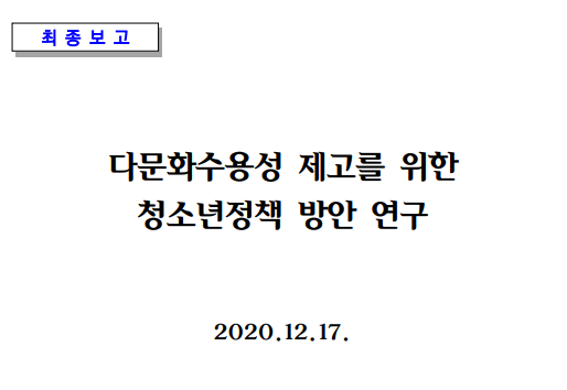 해당 연구는 약 7개월 간 한국여성정책연구원(김이선 책임연구원)이 수행하였다. 해당 연구의 목적은 포용국가 실현을 위한 다문화 친화적인 청소년정책 환경을 조성하기 위한 정책을 제언하는 것으로 특히 청소년정책 추진 인프라(생활권 청소년 수련시설)를 활용하여 다문화수용성 제고 방안을 제시하는 것을 주요 목적으로 하고 있다.
