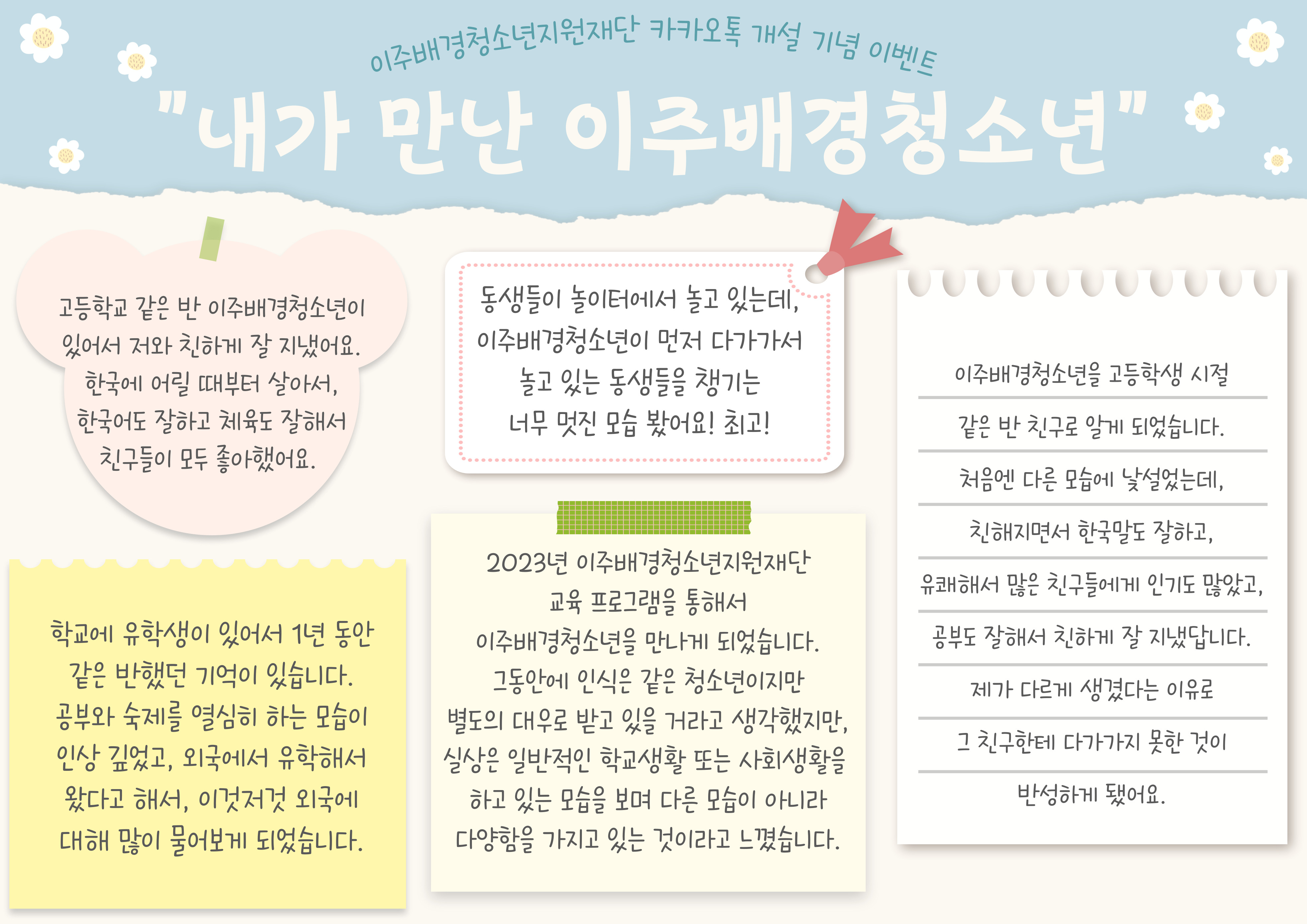 앞으로도 이주배경청소년지원재단은 우리 사회의 이주배경청소년들의 건강한 성장과 다문화 인식개선을 위해 더욱 다양하고 활발한 홍보 활동을 펼쳐나갈 예정이다.