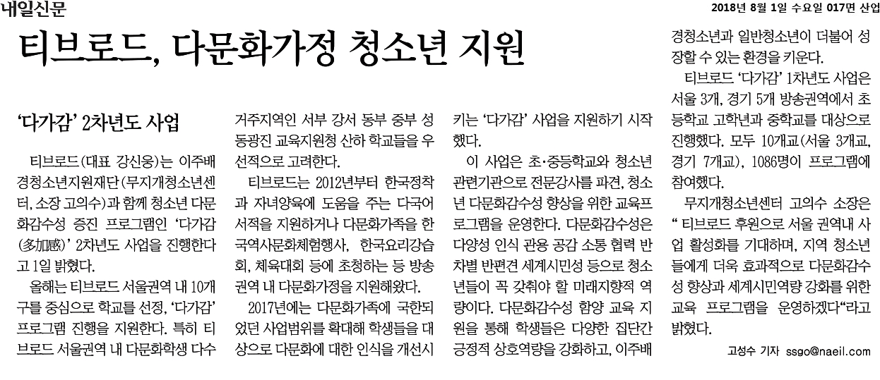 1) 티브로드, 다문화가정 청소년 지원 [내일신문 석간기사, 2018. 8. 1.]
