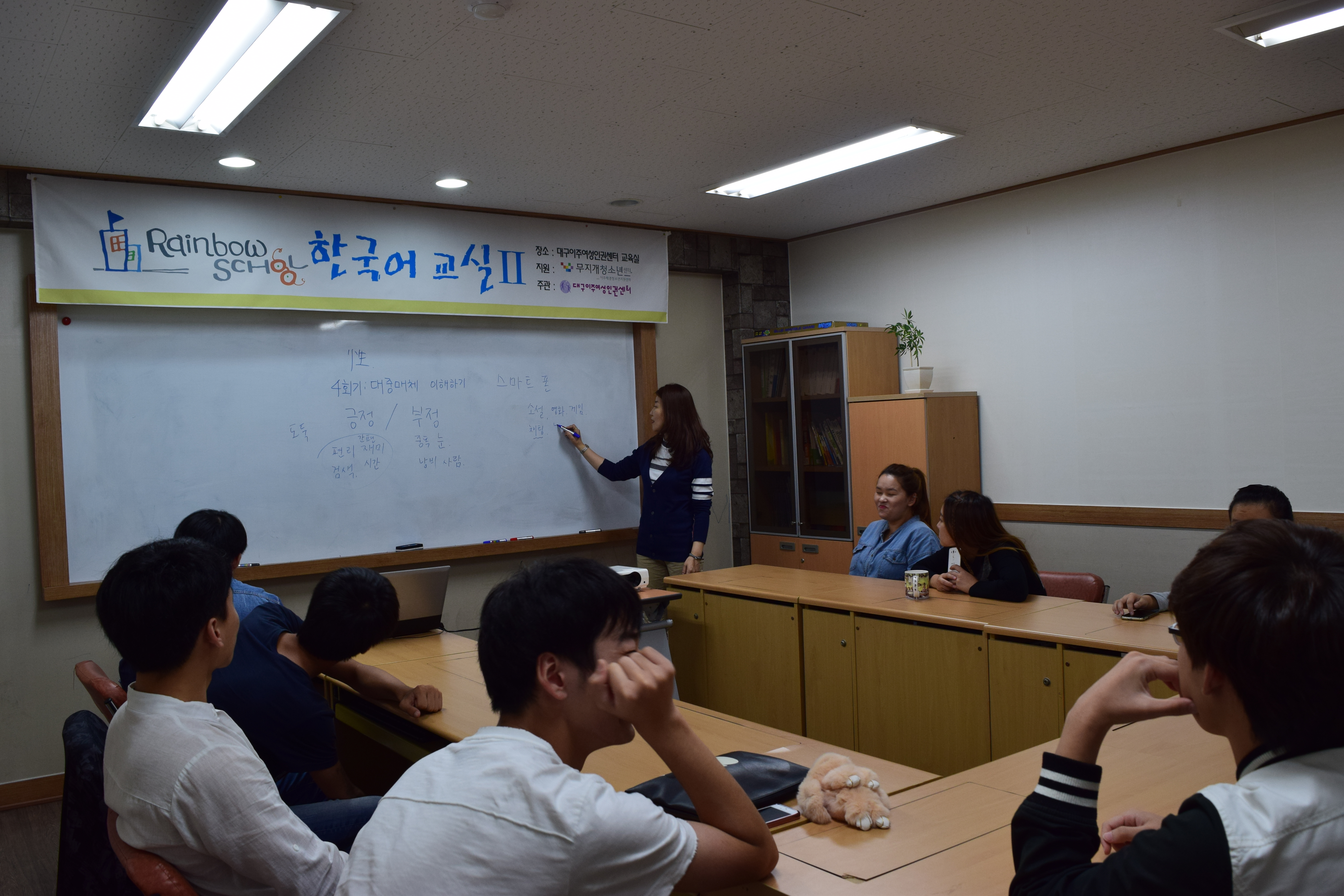 뿐만 아니라 이주배경청소년들이 한국사회에 안정적으로 정착하기 위해서는 한국어 교육이 필수적이라고 생각하여 2015년부터 레인보우스쿨을 시작하였습니다. 이주배경청소년들이 레인보우스쿨을 통해서 한국어공부 및 공동체 활동을 할 수 있게 되면서, 우리 센터는 이들의 숨통이 트이는 공간, 미래를 준비할 수 있는 든든한 버팀목으로서의 공간이 되고 있습니다.