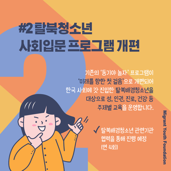 기존의 '동기야 놀자' 프로그램이 '미래를 향한 첫 걸음'으로 개편되어 한국 사회에 갓 진입한 탈북배경청소년을 대상으로 성, 인권, 진로, 건강 등 주제별 교육을 운영합니다. (탈북배경청소년 관련기관 협력을 통해 진행 예정/연 4회)