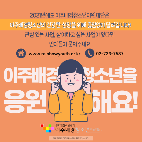 2021년에도 이주배경청소년지원재단 이주배경청소년의 건강한 성장을 위해 끊임없이 달려갑니다! 관심있는 사업, 참여하고 싶은 사업이 있다면 언제든지 문의주세요.