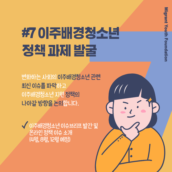 변화하는 사회의 이주배경청소년 관련 최신 이슈를 파악하고 이주배경청소년 지원 정책의 나아갈 방향을 논의합니다. (이주배경청소년 이슈브리프 발간 및 온라인 정책 이슈 소개/4월, 8월, 12월 예정)