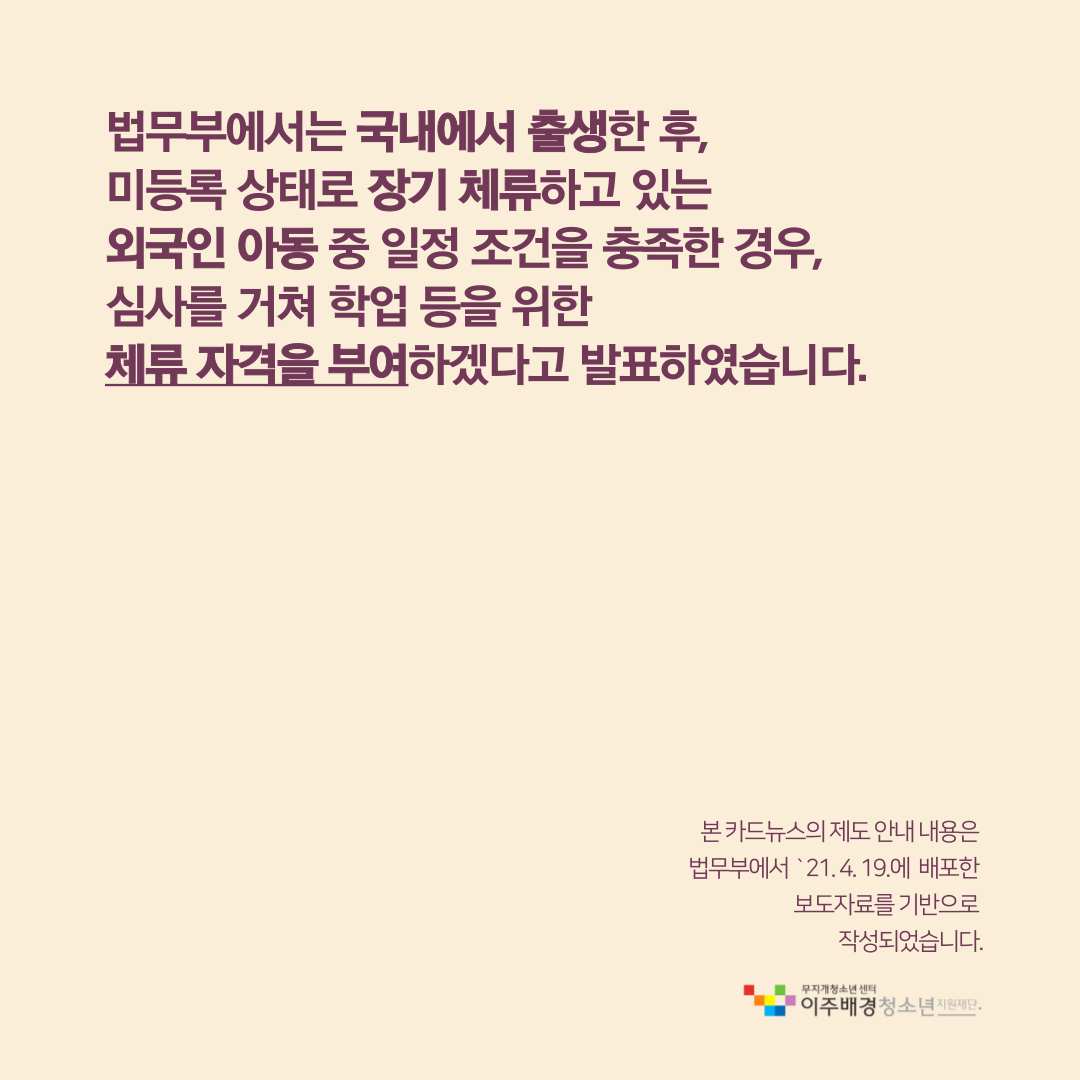 법무부에서는 국내에서 출생한 후, 미등록 상태로 장기체류 하고 있는 외국인 아동 중 일정 조건을 충족한 경우, 심사를 거쳐 학업 등을 위한 체류자격을 부여하겠다고 발표하였습니다.