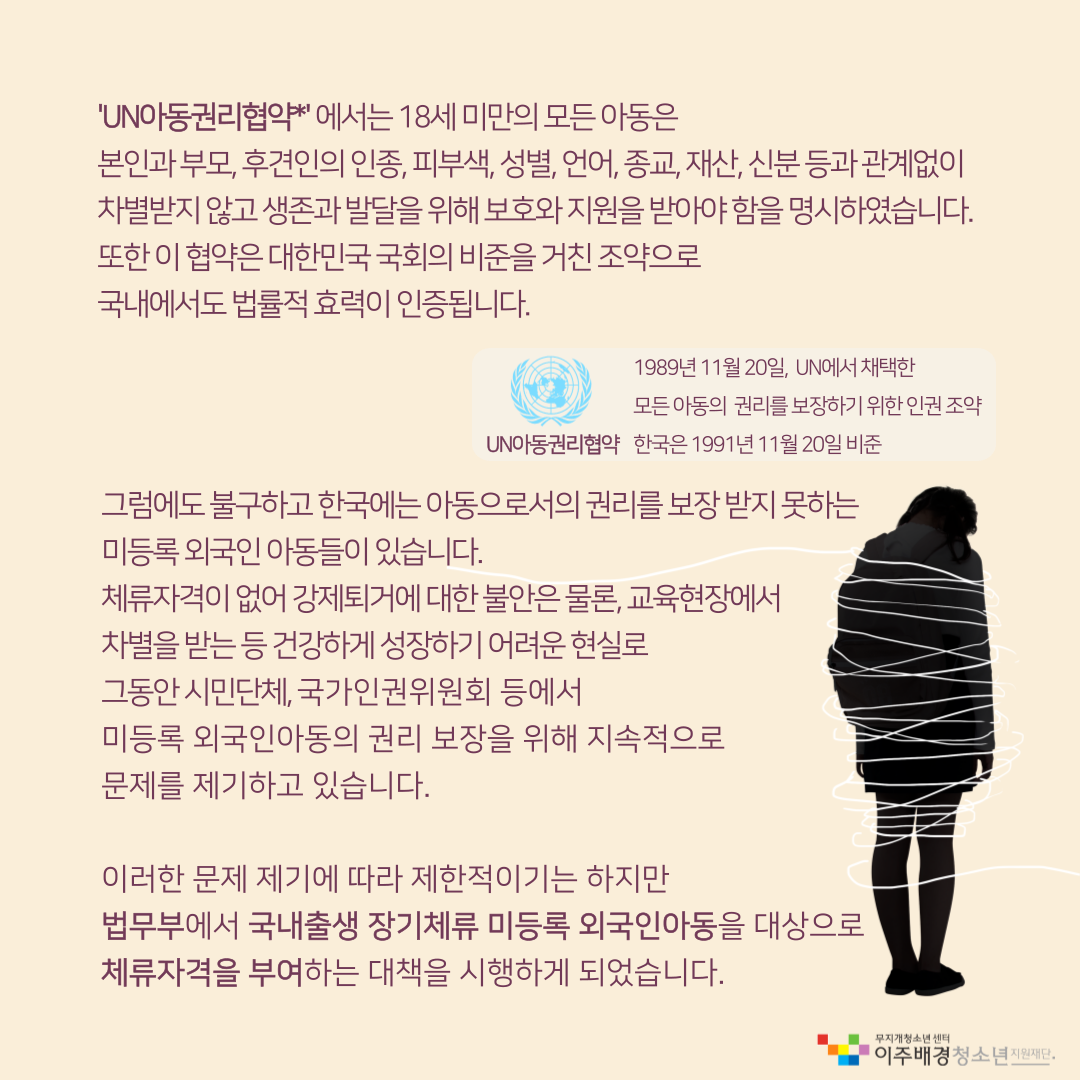그럼에도 불구하고 한국에는 아동으로서의 권리를 보장 받지 못하는 미등록 외국인 아동들이 있습니다. 체류자격이 없어 강제퇴거에 대한 불안은 물론, 교육현장에서 차별을 받는 등 건강하게 성장하기 어려운 현실로 그동안 시민단체, 국가인권위원회 등에서 미등록 외국인아동의 권리 보장을 위해 지속적으로 문제를 제기하고 있습니다.