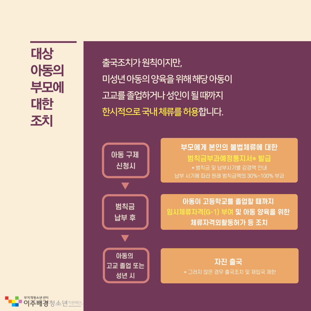 2) 범칙금 납부 후: 아동이 고등학교를 졸업할 때까지 임시체류자격(G-1) 부여 및 아동 양육을 위한 체류자격외활동허가 등 조치