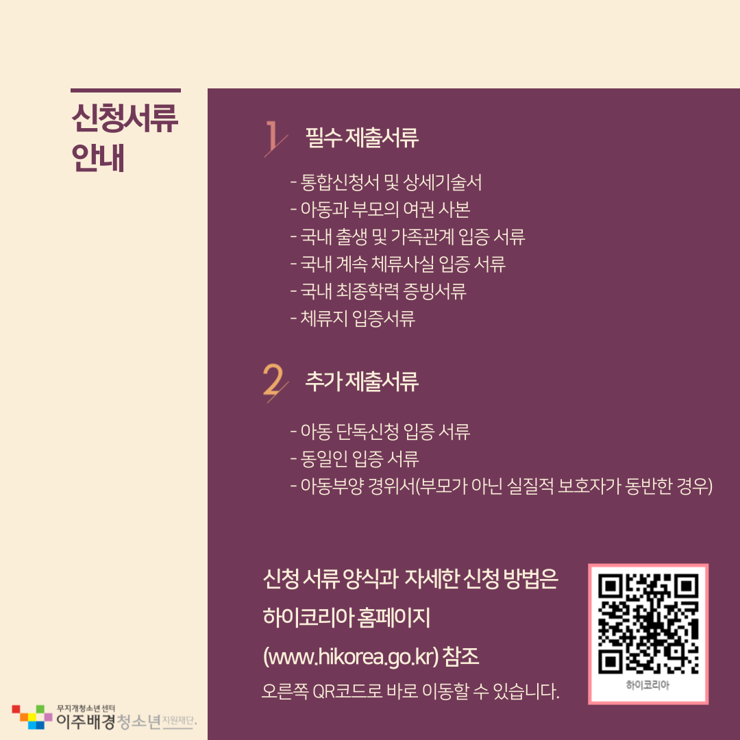 ○ 신청방법: 대상 아동과 부모(보호자)가 함께 관할 출입국 ·외국인청(사무소) 방문하여 신청