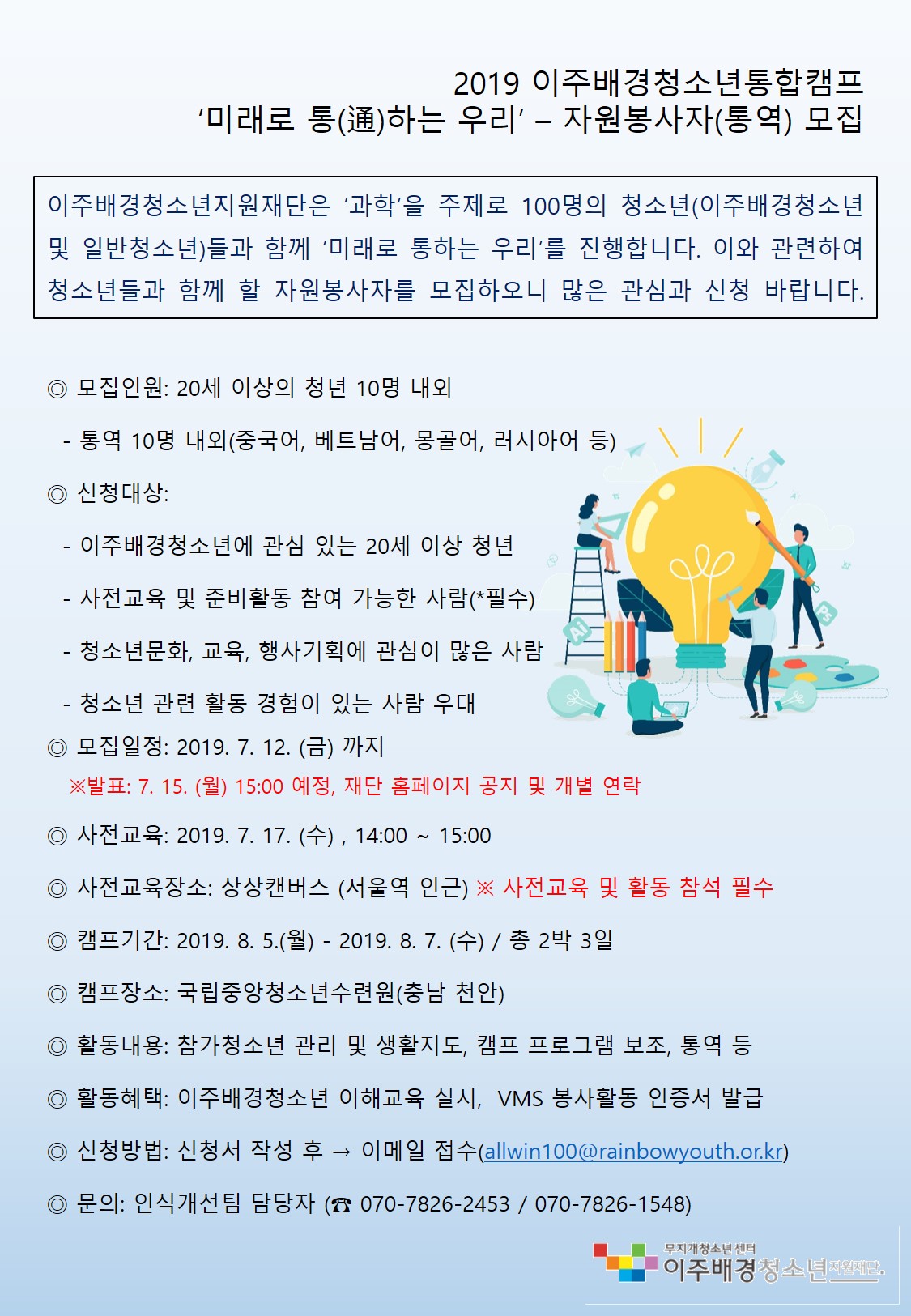 '2019 이주배경청소년통합캠프' 자원봉사자 모집과 관련하여,