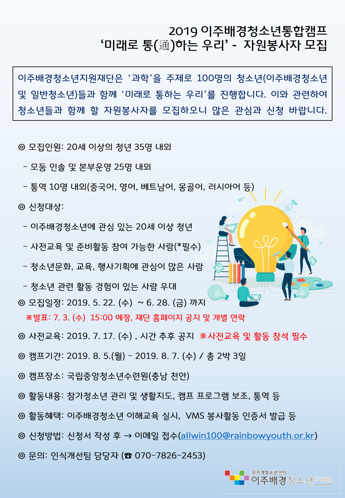[모집] 2019 이주배경청소년통합캠프 자원봉사자 모집(통통통캠프: 미래로 통하는 우리)