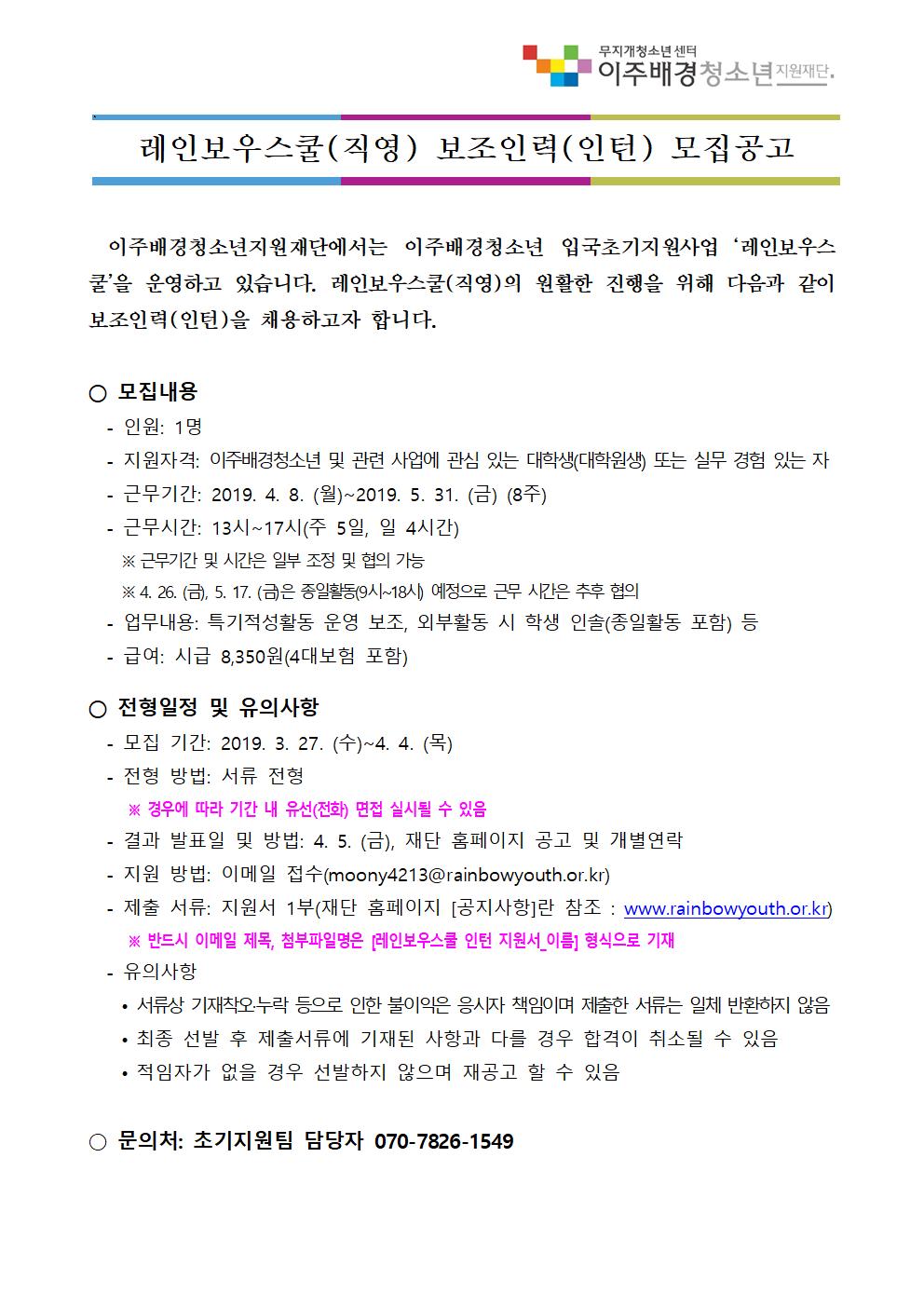 [모집] 레인보우스쿨(직영) 보조인력(인턴) 모집 공고
