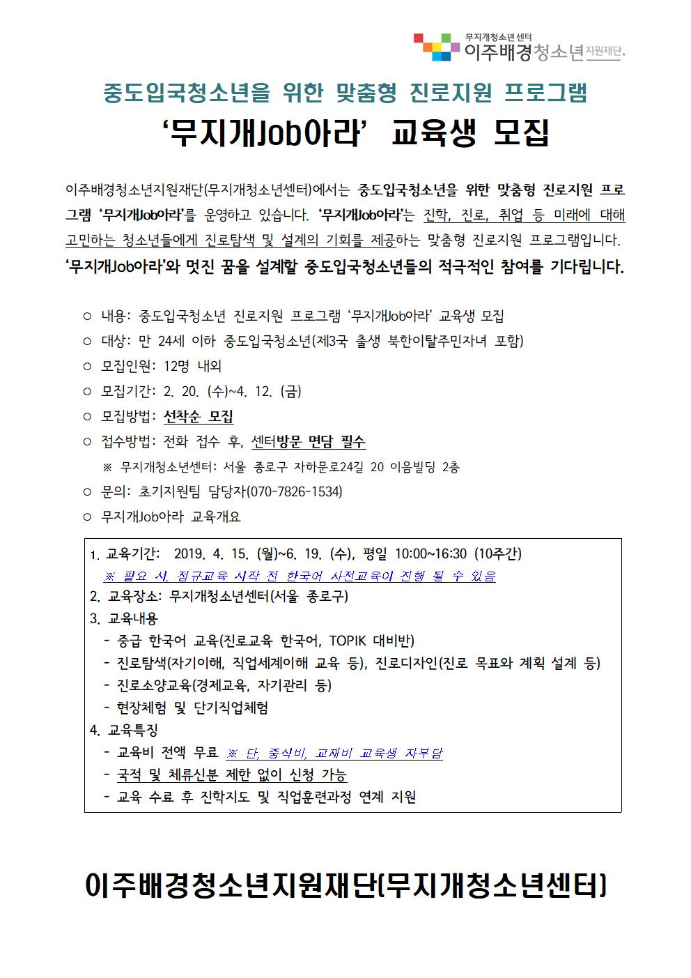 [모집_기간연장] 2019 중도입국청소년 진로교육 '무지개Job아라' 교육생 모집