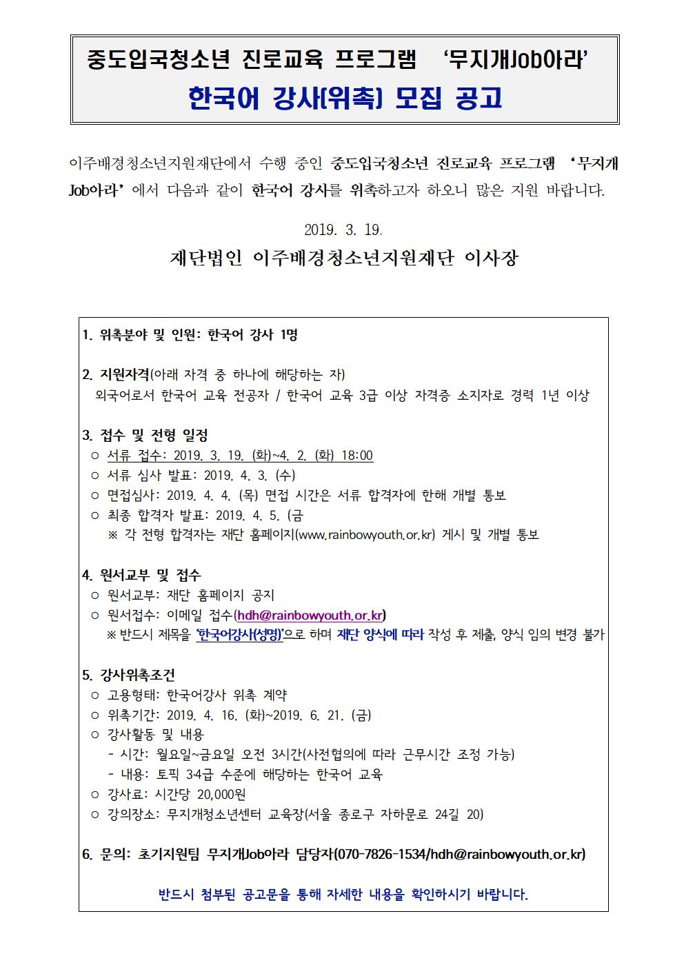 1. 무지개Job아라 직영 상반기 한국어강사 위촉 모집 공고(19.hwp