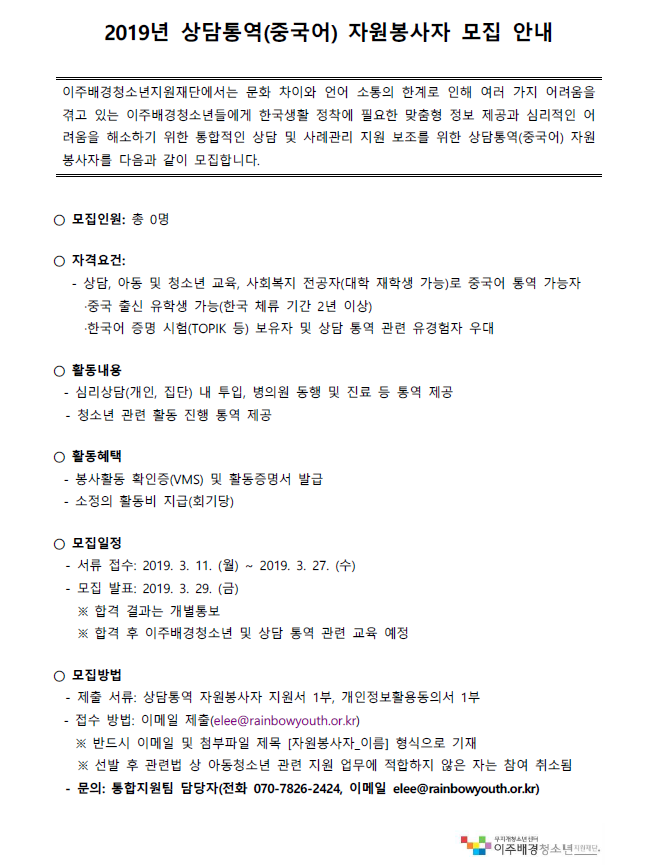 [모집] 2019년 이주배경청소년지원재단 상담통역(중국어) 자원봉사자 2차 모집 공고