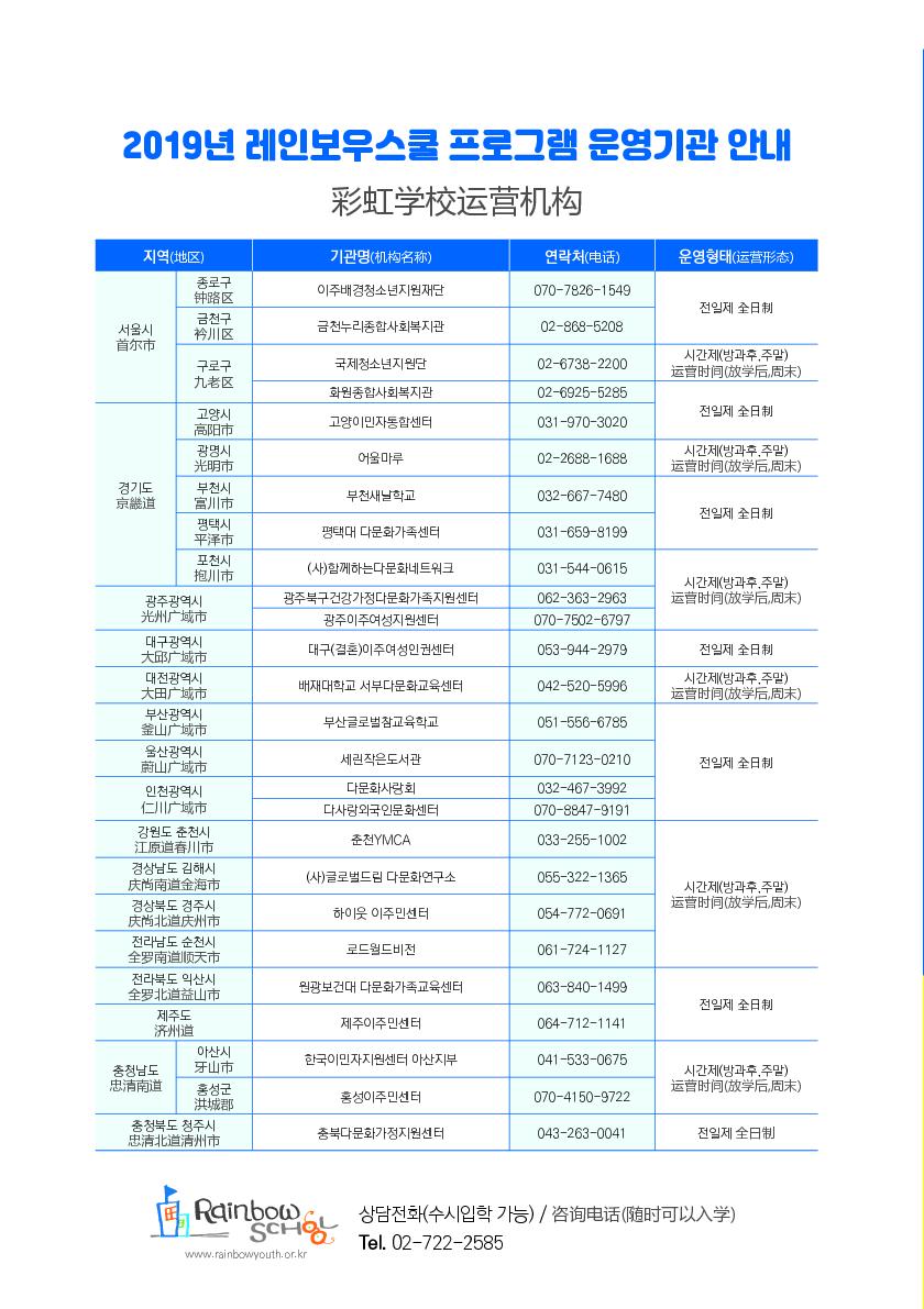 [안내] 2019년 레인보우스쿨 운영 기관 현황(26개소)