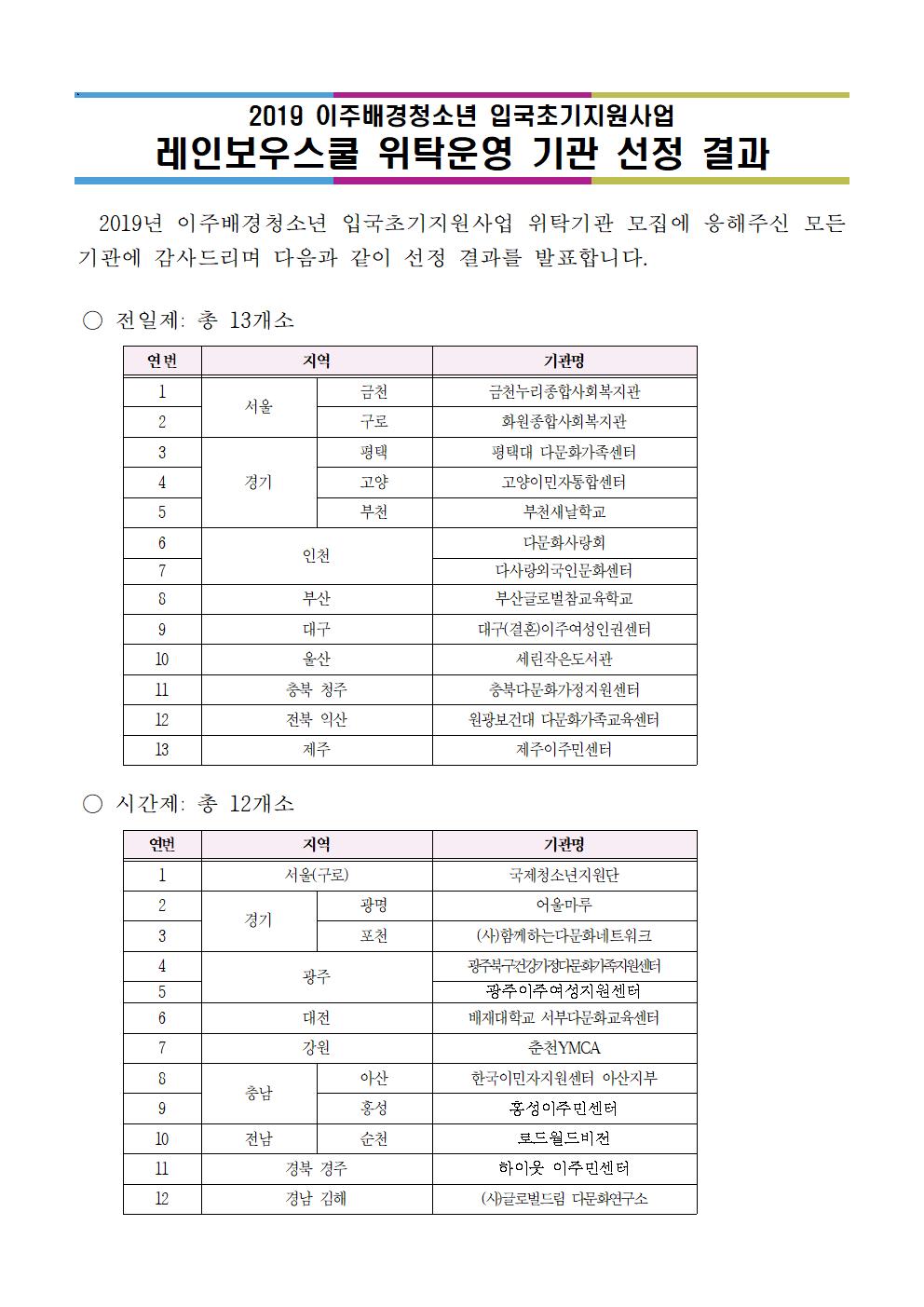 [발표] 2019년 레인보우스쿨 위탁운영 기관 선정 결과