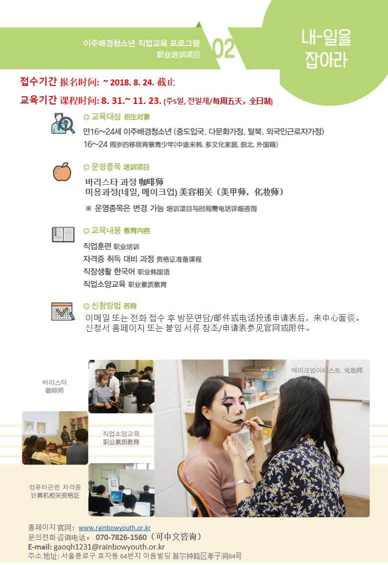 이주배경청소년지원재단(무지개청소년센터)에서는 이주배경청소년을 위한 직업교육 프로그램 ‘내-일을 잡아라’를 운영합니다. ‘내-일을 잡아라’는 이주배경청소년들의 특성을 고려하여 전문적인 직업교육과정을 통하여 실질적 직업능력을 향상을 위한 프로그램입니다. 직업인의 꿈을 키워 한국사회에 안정적으로 정착하기를 원하는 이주배경청소년들의 적극적인 참여를 기다립니다.