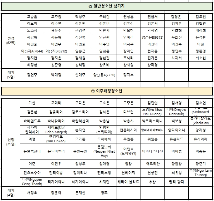 ★ 선정 및 대기자 청소년 명단은 가나다 순으로 나열