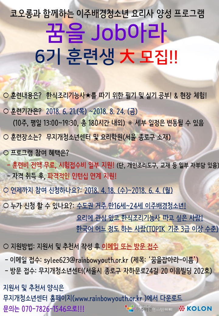 [모집] 코오롱 후원 이주배경청소년 조리기능사 양성 프로그램 '꿈을 Job아라' 6기 대상자 모집