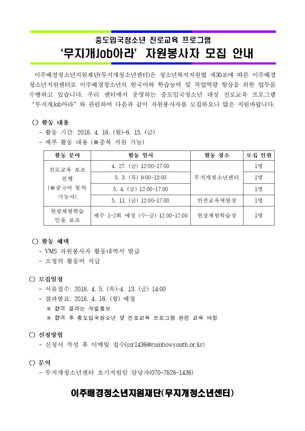 [모집] 진로교육 프로그램 '무지개Job아라' 자원봉사자 모집