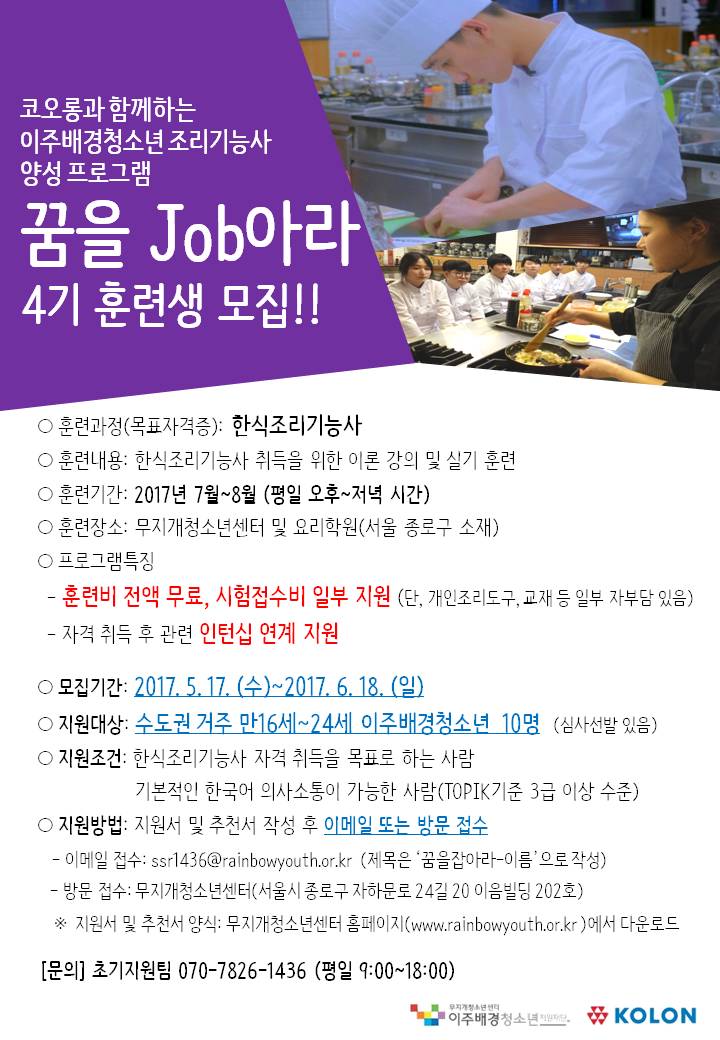 [모집] 코오롱과 함께하는 조리기능사 양성프로그램 '꿈을 Job아라' 4기 훈련생 모집
