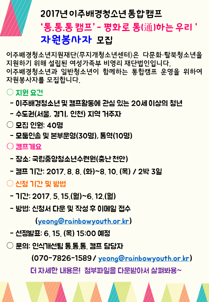 [모집] 2017년 이주배경청소년 통합캠프 '통.통.통. 캠프' 자원봉사자 모집