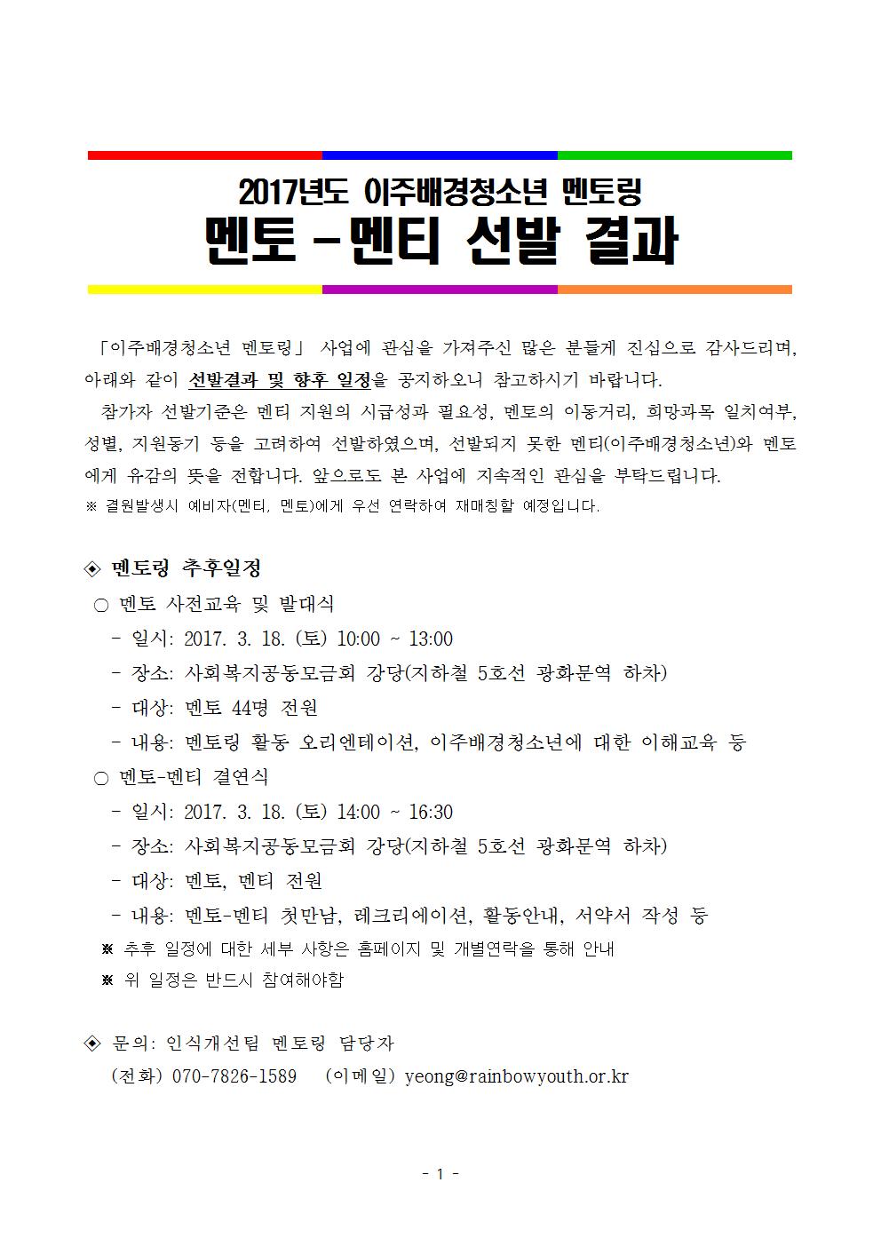 [발표] 2017년도 이주배경청소년 멘토링 참가자(멘토-멘티) 선발 결과