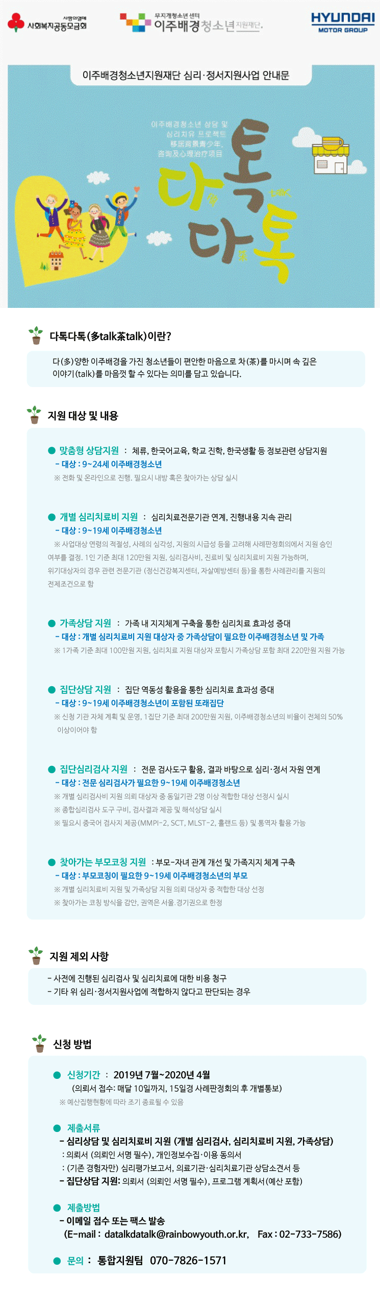 [모집] 현대차그룹이 함께하는 '다톡다톡' 심리치료비 지원 사업 안내