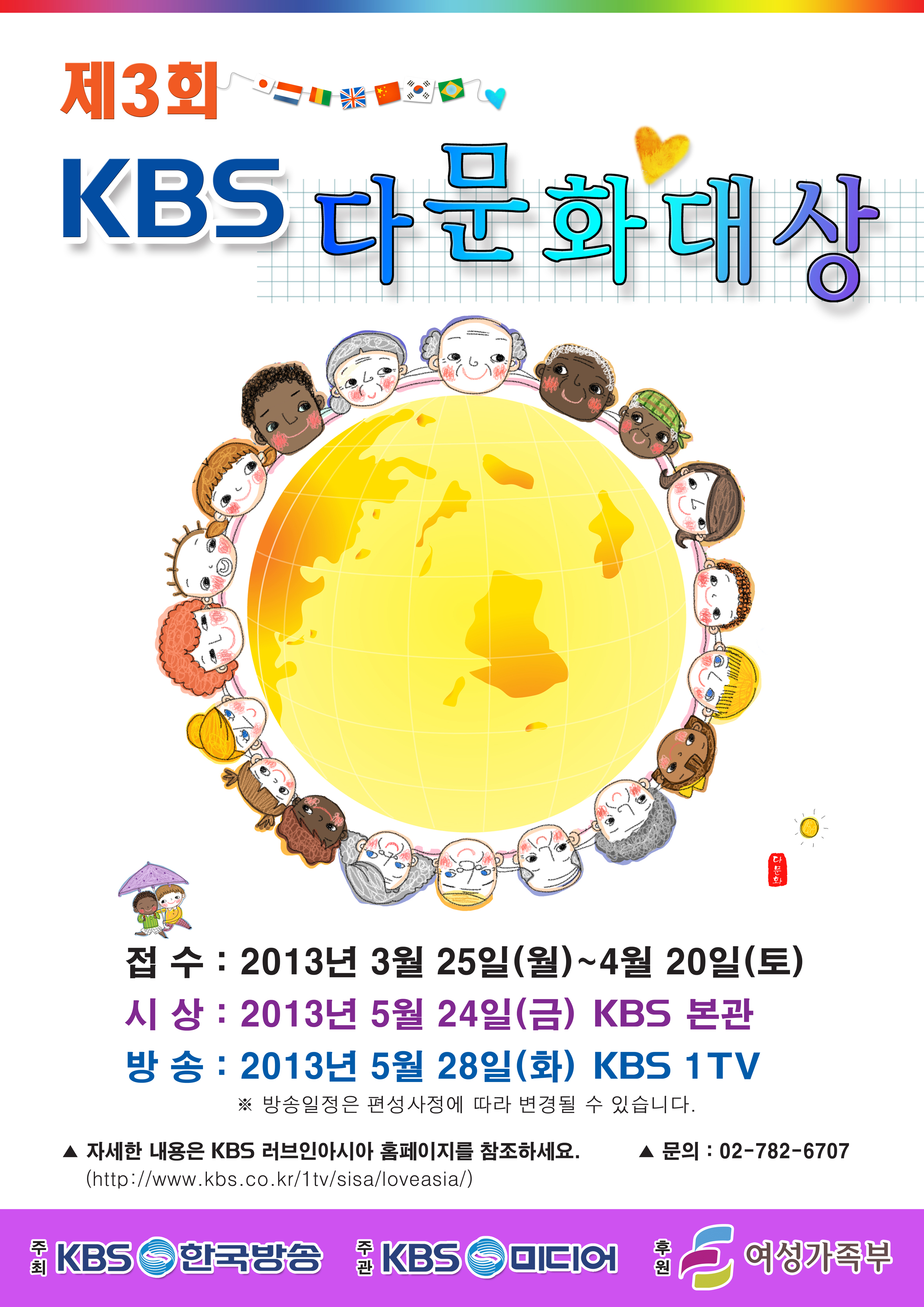 KBS에서 여성가족부와 함께 제 3회 다문화대상을 진행하고 있습니다. 본 행사는 한국에서 성공적으로 정착하고 있는 다문화인들을 격려하기 위해 마련되었습니다.