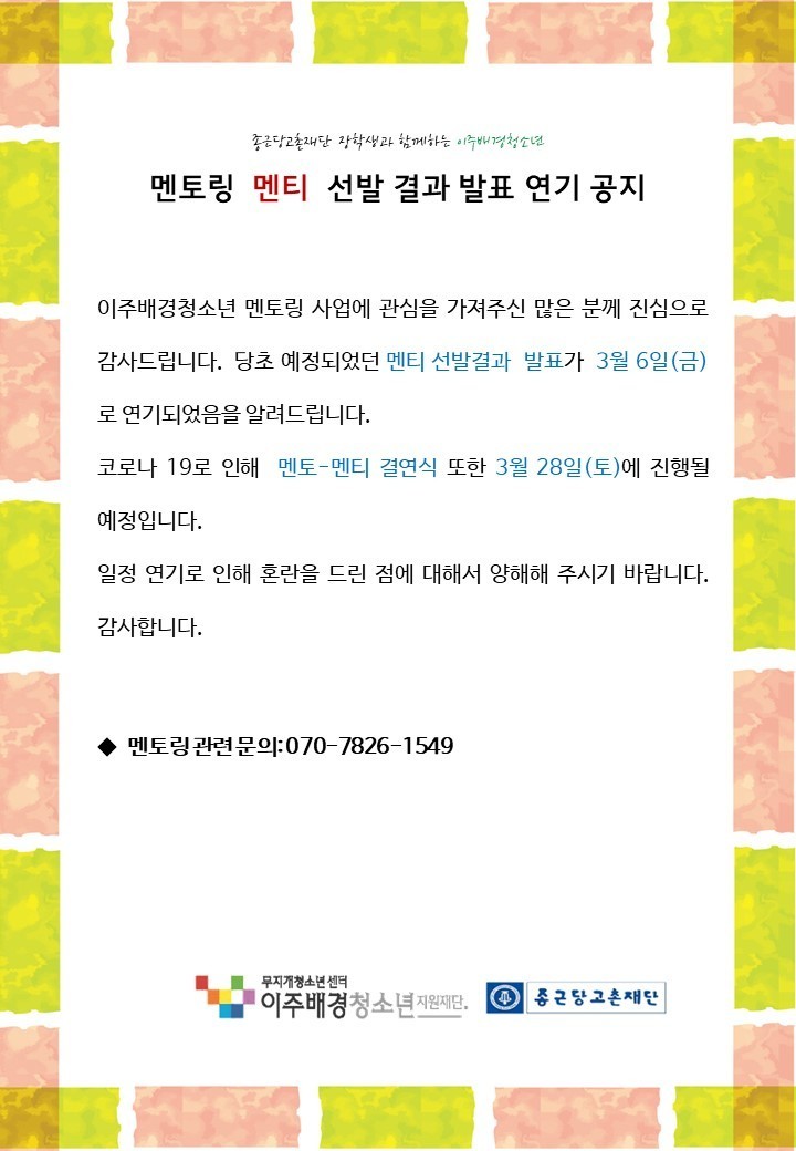 종근당고촌재단과 함께하는 이주배경청소년 멘토링 멘티 선발결과 발표 연기