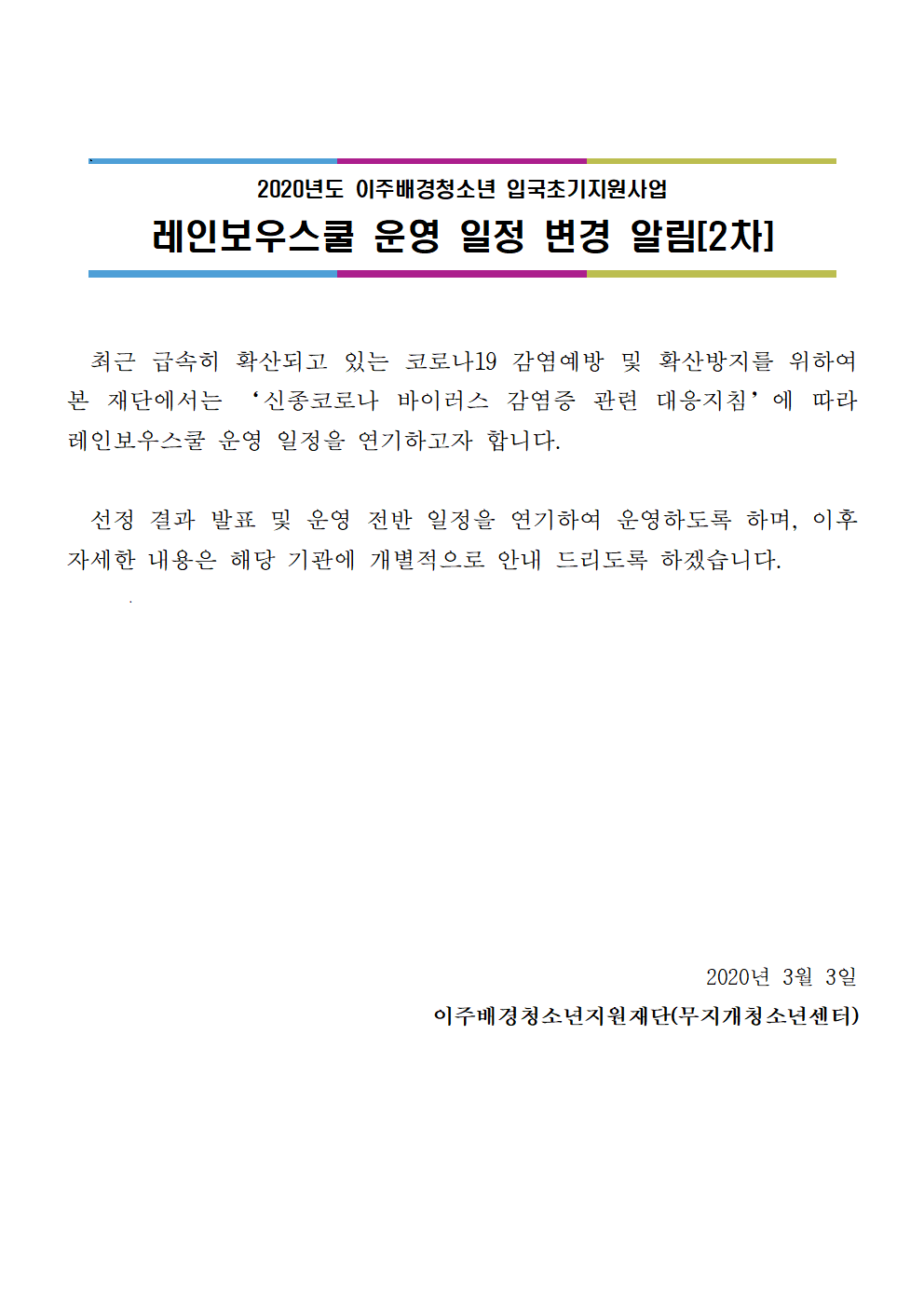 [공지]2020년도 레인보우스쿨 운영 일정 변경 알림[2차]