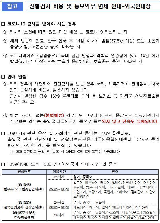 외국인 대상 선별검사 및 통보의무 면제 등 안내