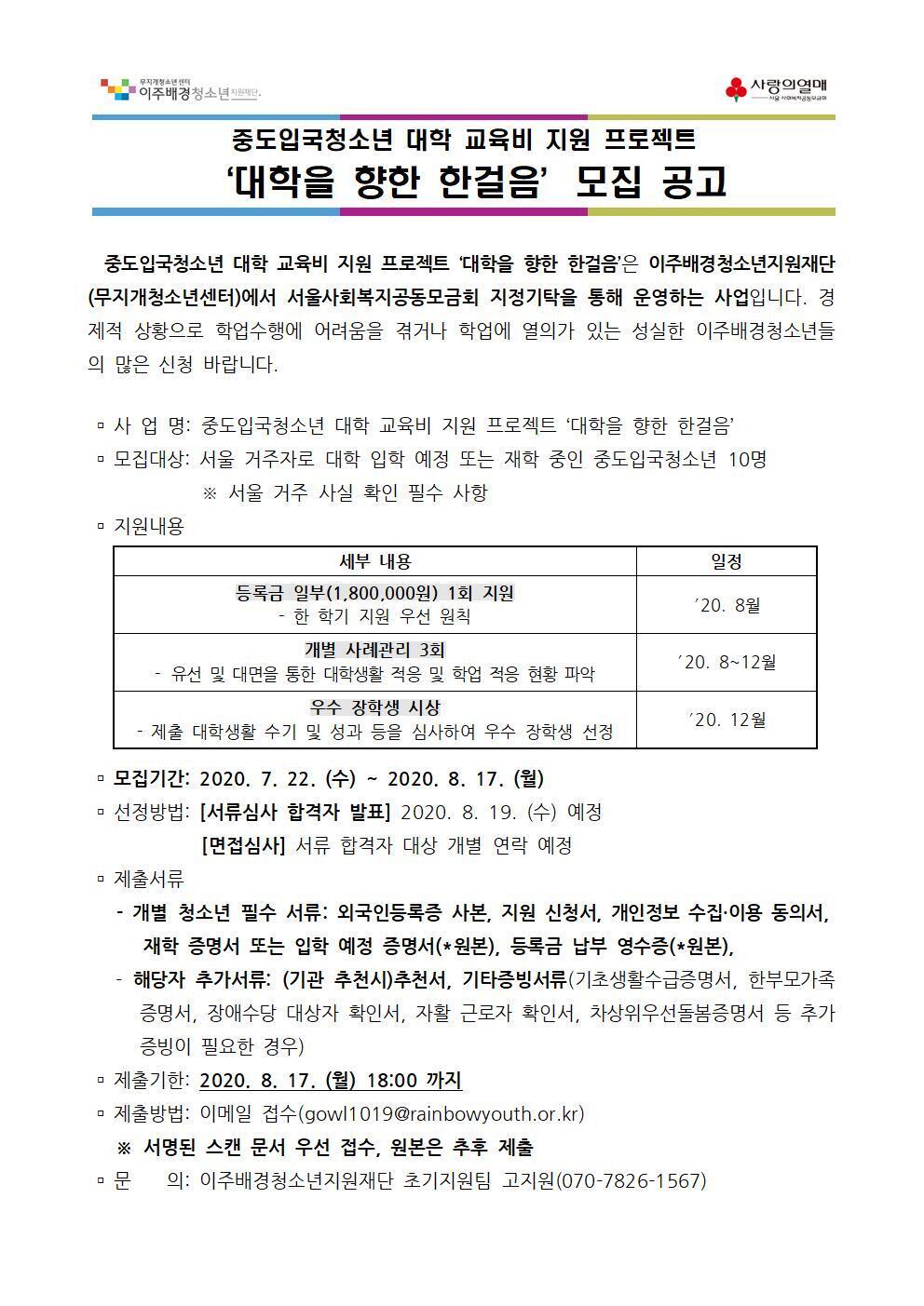 중도입국청소년 대학 교육비 지원 프로젝트 '대학을 향한 한걸음' 모집 공고