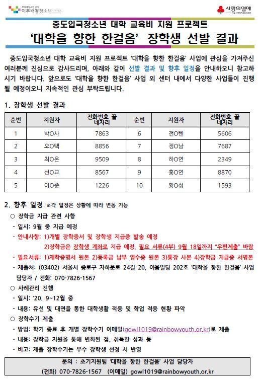 중도입국청소년 대학 교육비 지원 프로젝트 '대학을 향한 한걸음' 장학생 선발 결과