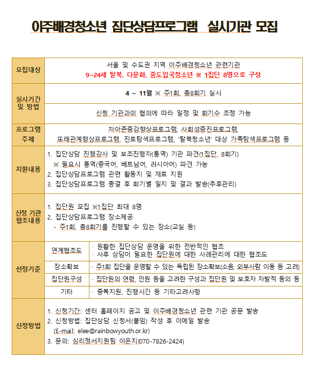 이주배경청소년지원재단에서는 2021년 집단상담프로그램 실시기관을 아래와 같이 모집합니다.