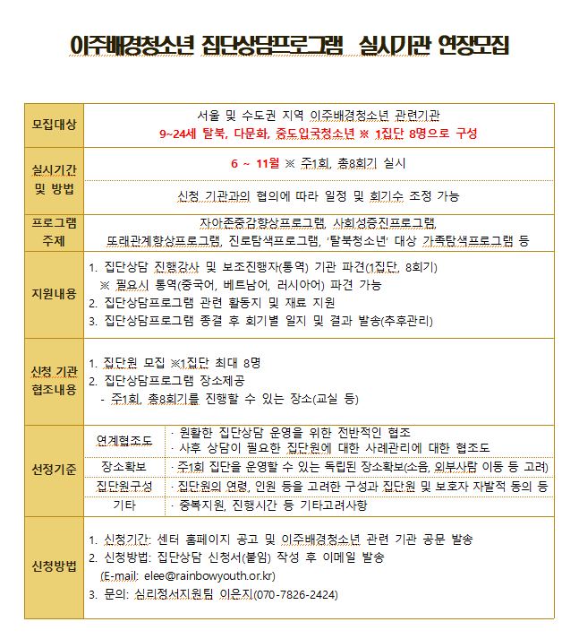 이주배경청소년지원재단에서는 2021년 집단상담프로그램 실시기관을 아래와 같이 연장모집합니다.