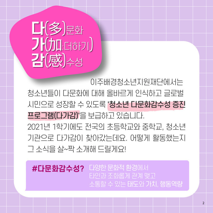 이주배경청소년지원재단에서는 청소년들이 다문화에 대해 올바르게 인식하고 글로벌 시민으로 성장할 수 있도록 '청소년 다문화감수성 증진 프로그램(다가감)'을 보급하고 있습니다. 2021년 1학기에도 전국의 초등학교와 중학교, 청소년 기관으로 다가감이 찾아갔는데요. 어떻게 활동했는지 그 소식을 살~짝 소개해드릴게요!