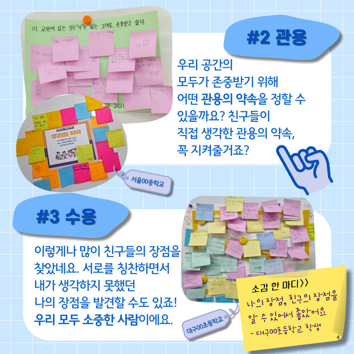- 우리 공간의 모두가 존중받기 위해 어떤 관용의 약속을 정할 수 있을까요? 친구들이 직접 생각한 관용의 약속, 꼭 지켜줄거죠?