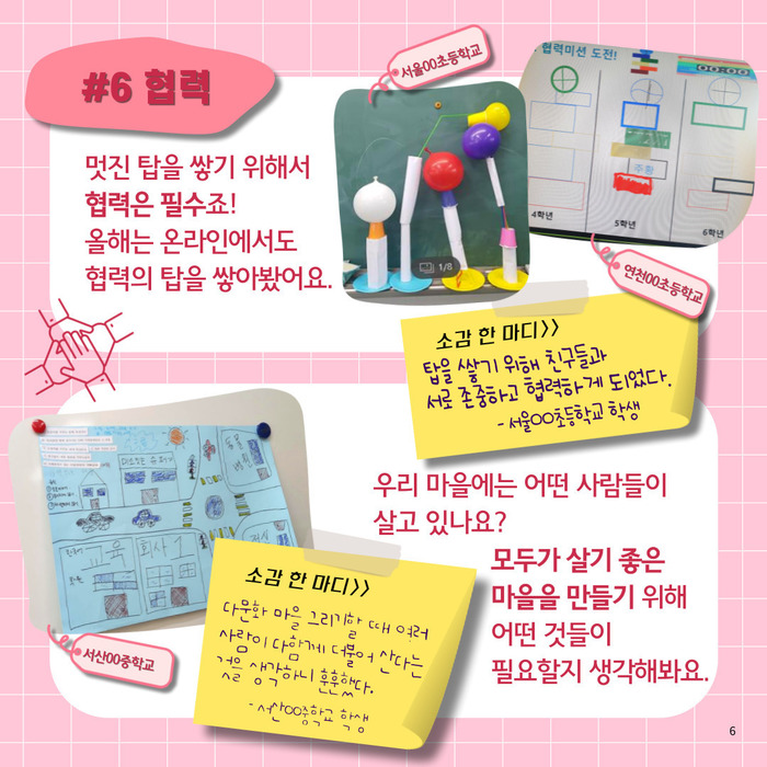 <소감 한 마디> 탑을 쌓기 위해 친구들과 서로 존중하고 협력하게 되었다. - 서울00초등학교 학생