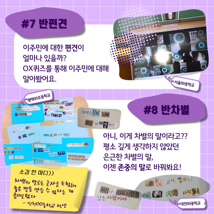 <소감 한 마디> 차별의 말로도 글자를 조합해 좋은 말을 만들 수 있다는 게 흥미로웠다. - 인천00중학교 학생