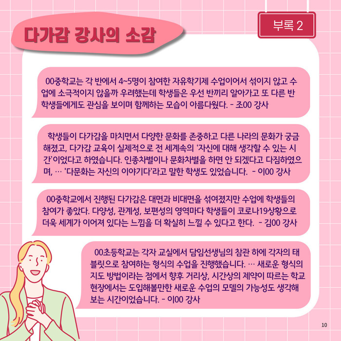 - 00중학교에서 진행된 다가감은 대면과 비대면을 섞여졌지만 수업에 학생들의 참여가 좋았다. 다양성, 관계성, 보편성의 영역마다 학생들이 코로나19상황으로 더욱 세계가 이어져 있다는 느낌을 더 확실히 느낄 수 있다고 한다. - 김00 강사